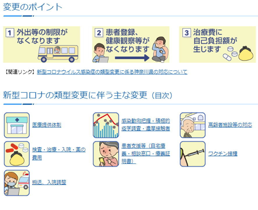 令和5年5月8日(月曜)に、新型コロナの感染症法上の位置付けが、5類に移行します。これに伴い変更される神奈川県の施策の紹介です。