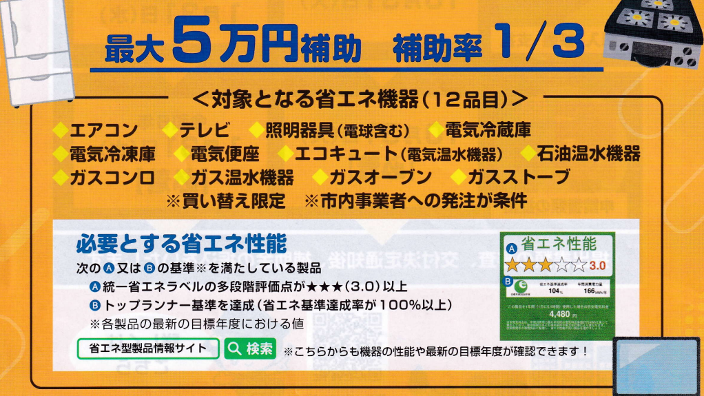 省エネ機器へ買い替えるための物品購入費用が補助されます。