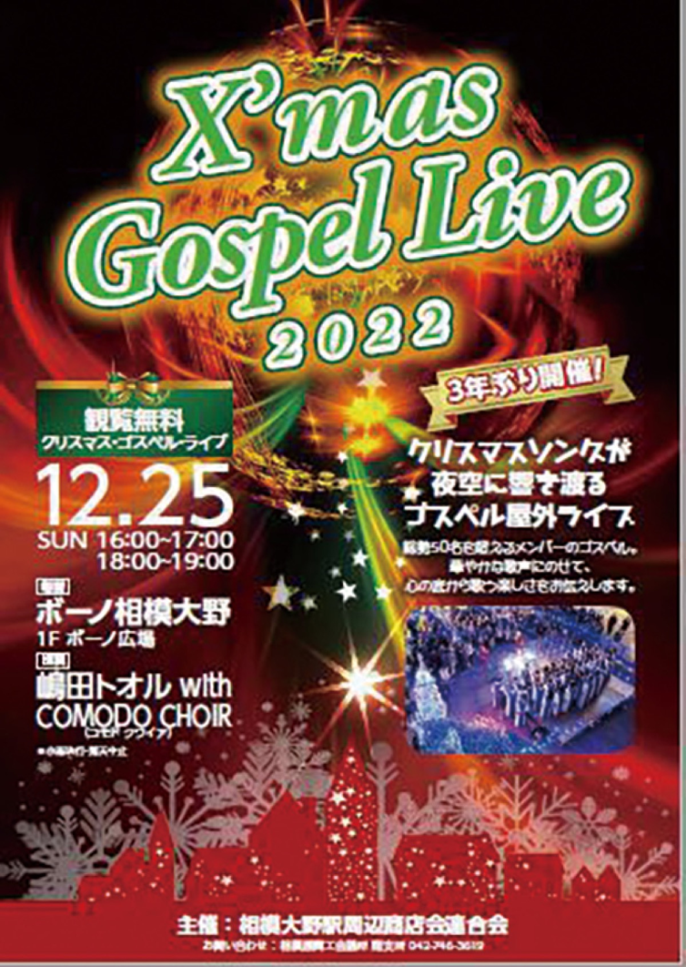 ボーノ相模大野ショッピングセンター1階のボーノ広場で、3年ぶりにクリスマス・ゴスペル・ライブ2022が開催されます。