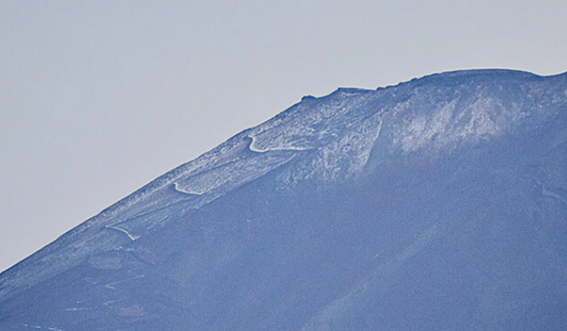 雪が積もって見えているのは富士山の東側斜面のようで、甲府地方気象台からは、積雪が確認ができないようです。もし21日付けで甲府地方気象台から初冠雪の発表があれば、平年より9日早く、昨年より31日早い観測となるそうです。
