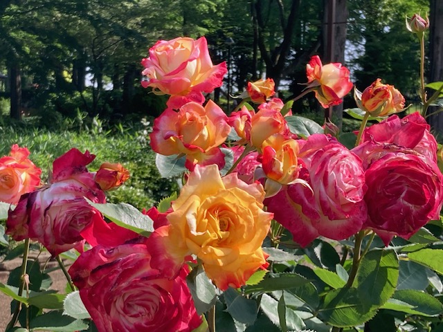 カラフルな色の薔薇の花が見事です。
