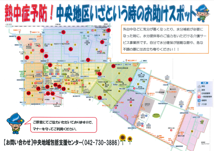 中央地域包括支援センターでは、外出中の急な不調や緊急時に、水分提供や休息の協力が可能な介護サービス事業所を募りリスト化しました。