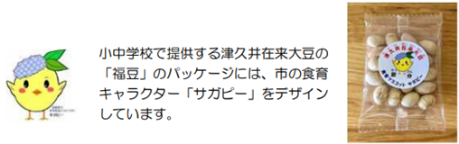 全小中学校等で提供される福豆には、相模原市内産の「津久井在来大豆」が使用されます。パッケージには、相模原市の食育キャラクター「サガピー」をデザインしています。