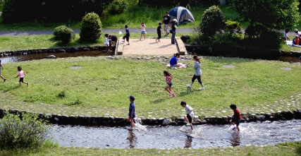 相模川と山に囲まれた公園には子どもが安心して遊べる水辺があり、10月30日(金)まで小川が放流されます。(清掃日は水は流れません。)