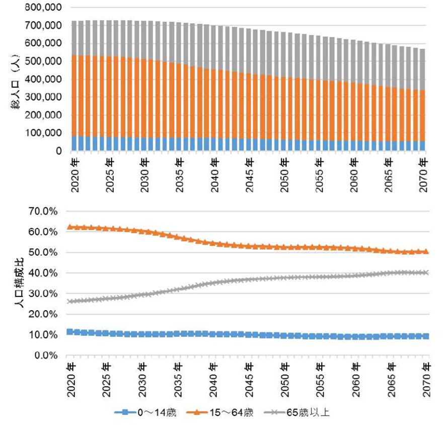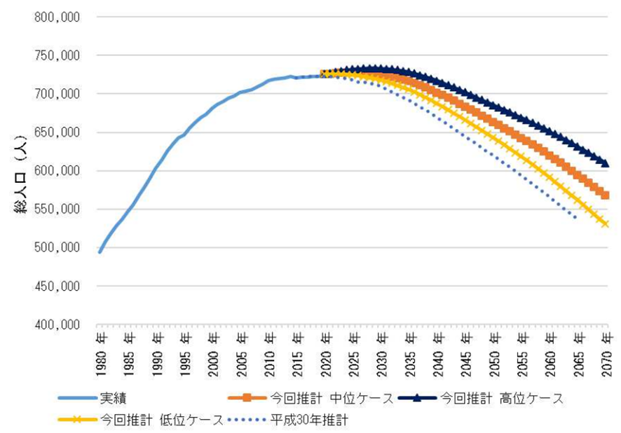 2020年の725,493人から増加し、2025年に728,042人でピークを迎え、その後は減少を続け2040年には701,773人、2070年には568,161人になる。