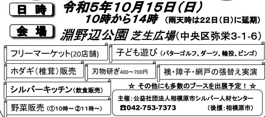 2023-10-10 シルバーまつり 10/15 開催!(2023/10/10) 大人 子ども 相模原市からのお知らせ イベント開催案内 シニア シビックプライド 地域の皆様に日頃の感謝を込めて 「新型コロナウィルス感染症 拡大防止」を忘れずに、 家に帰ったら、手洗い、うがい、除菌を忘れないでください。