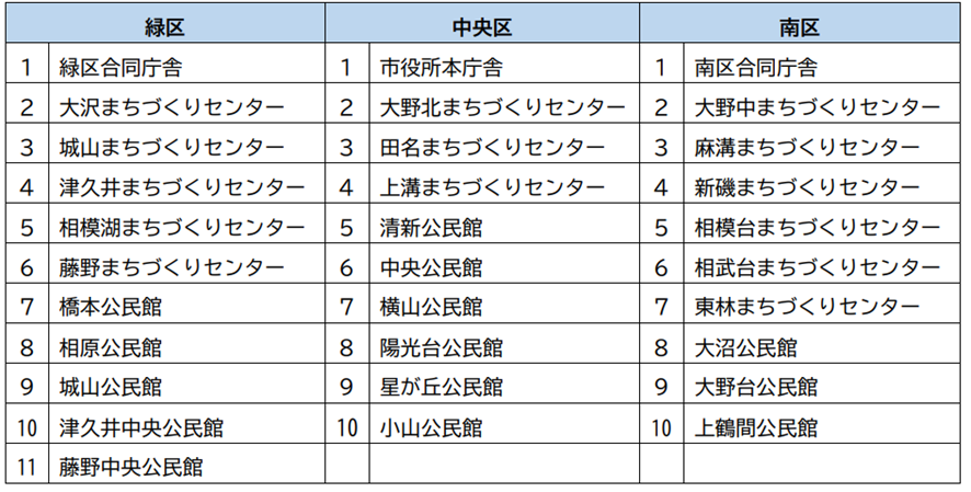 相模原市役所、緑区役所、南区役所、まちづくりセンター及び一部の公民館に設置